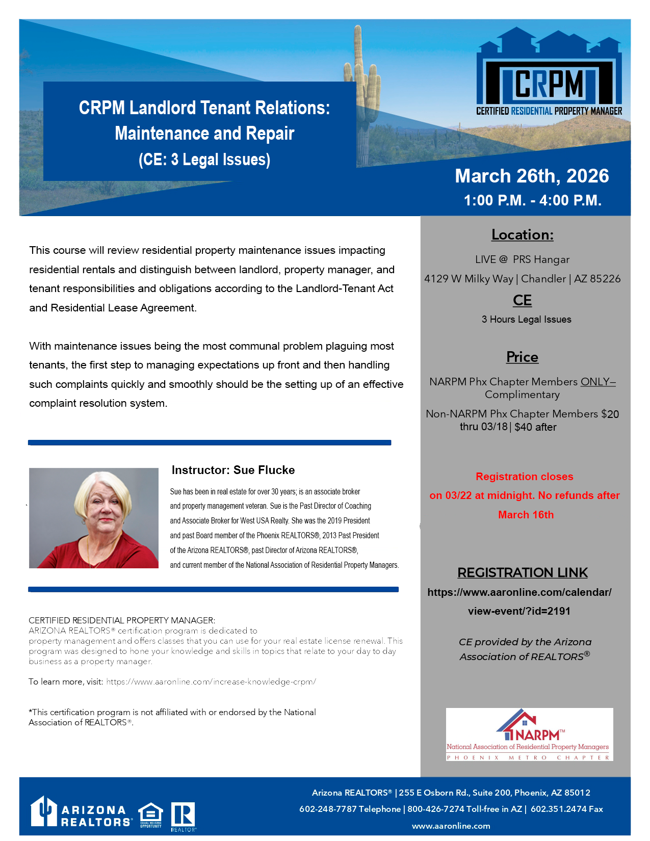 CRPM Landlord Tenant Relations: Maintenance and Repair (CE: 3 Legal Issues ) Thursday, March 26, 2026 1:00 PM 4:00 PM 13:00 16:00 PRS Hangar 4129 West Milky Way Chandler, AZ, 85226 United States (map) Google Calendar ICS Class is from 1:00 - 4:00Instructor: Sue Flucke